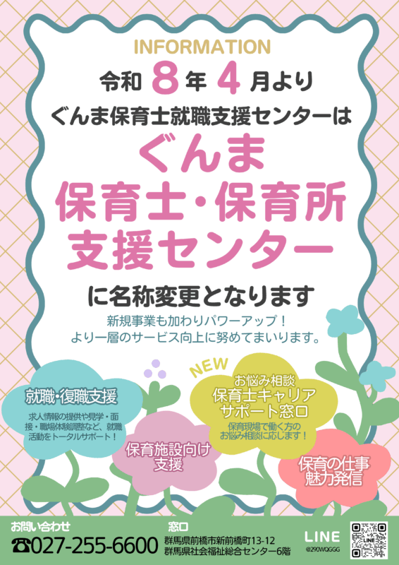 令和8年4月より、ぐんま保育士就職支援センターは【ぐんま保育士就職支援センター】に名称変更いたします。